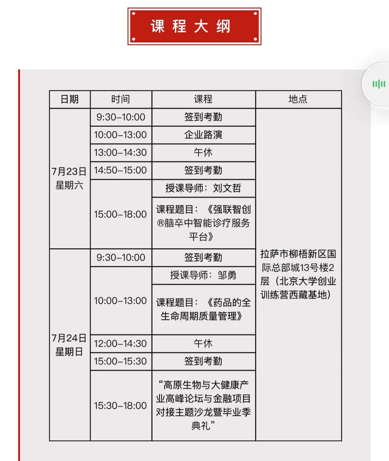 7月23—24日,北京大学创业训练营“西藏高原生物与大健康产业特训营”(四期班)结业课程将在拉萨高新区(柳梧新区)开课,特邀北京市药监局核查中心GMP顾问邹勇老师;强联智创(北京)科技有限公司创始人、CEO刘文哲老师,为各位企业家、创业者答疑解惑,共同对医疗及健康产业发展、企业运营和产学研结合的项目落地进行专题研讨。课程开放部分旁听名额,欢迎报名参加学习。
