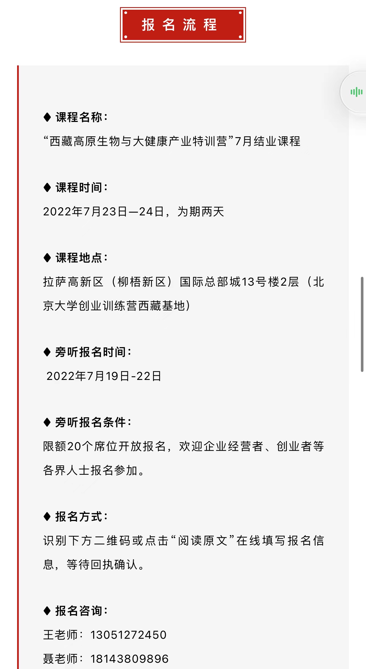 “西藏高原生物与大健康产业特训营”四期班即将于2022年7月圆满结业,北京大学创业训练营西藏基地将于2022年9月正式举办为期一年的“西藏高原生物与大健康产业特训营”二期班,以“西藏高原生物与大健康产业”为主题,深度挖掘行业的商业机会,欢迎社会各界企业家与创业、就业人士关注参与。