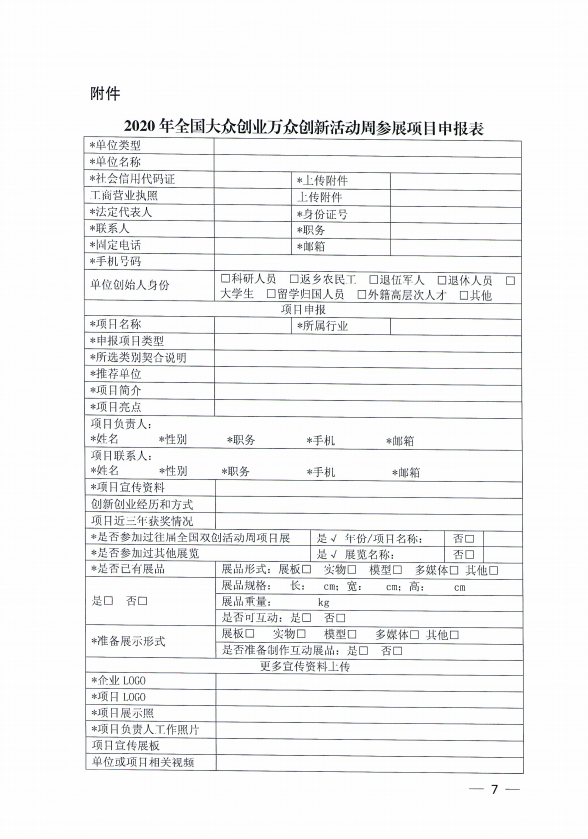 请申报单位登录中国科协创新资源共享平台( http://www.qiyekcxie.com ),点击“2020年全国大众创业万众创新活动周参展项目申报”,注册账号,在线申报(样表见附件)。另请申报单位及时关注微信公众号“双创周”发布的相关信息;