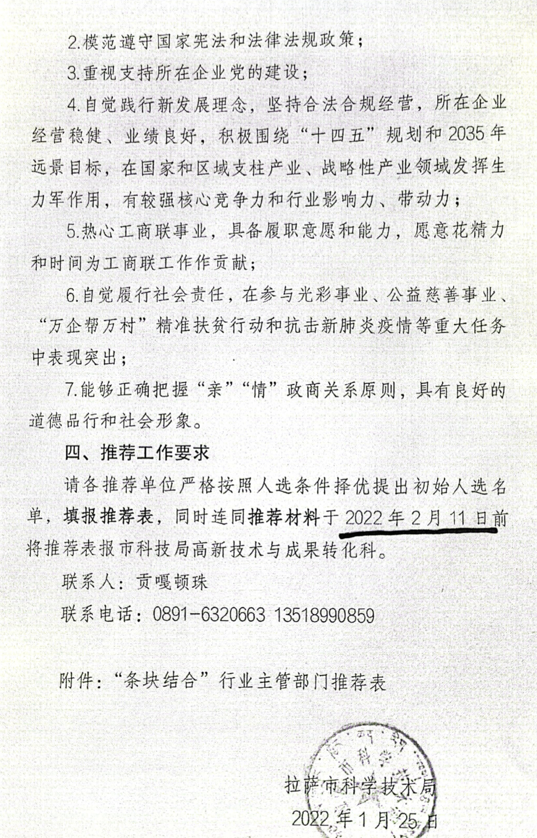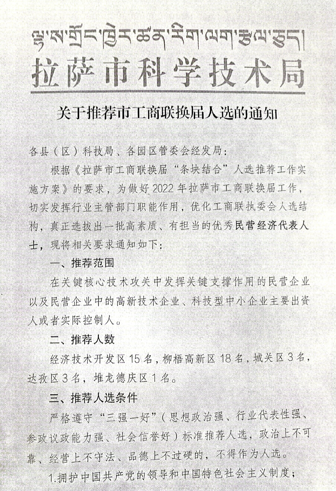 根据拉萨市工商联换届工作的相关要求,为积极认真做好此项工作,现将《关于推荐市工商联换届人选的通知》转发给大家,柳梧新区共计18个名额,望各载体入驻企业高度重视积极报名,请于2月10日前将推荐表(纸质版)送至管委会经发局2107办公室。