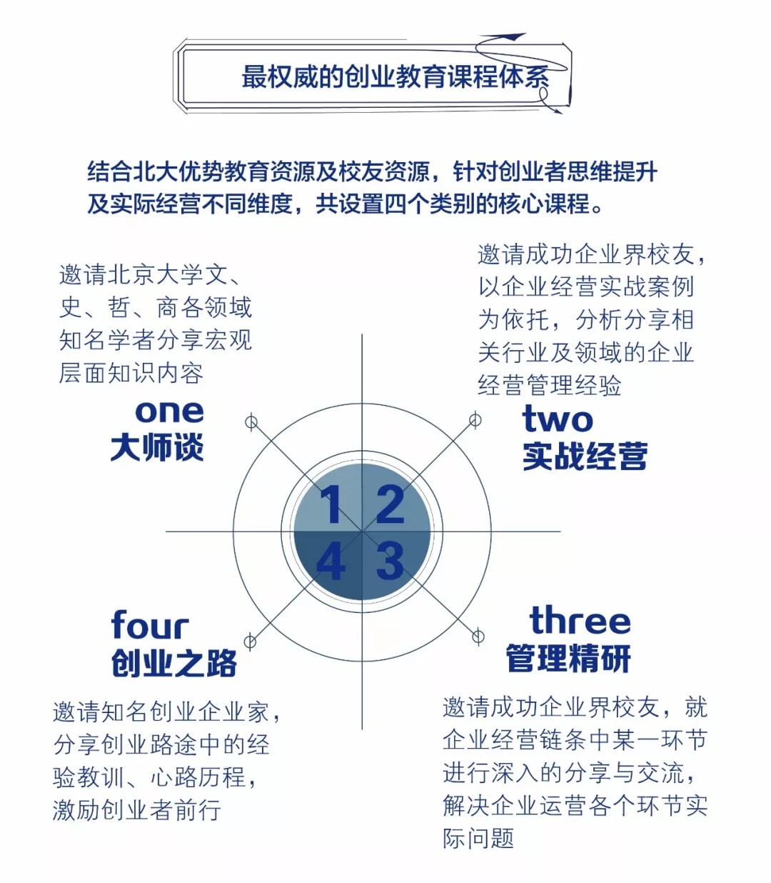 一、创业实战课程:最权威的实战创业教育课程,结合北大优势教育资源及校友资源,针对创业者思维提升、企业管理经营及产业课程相结合;