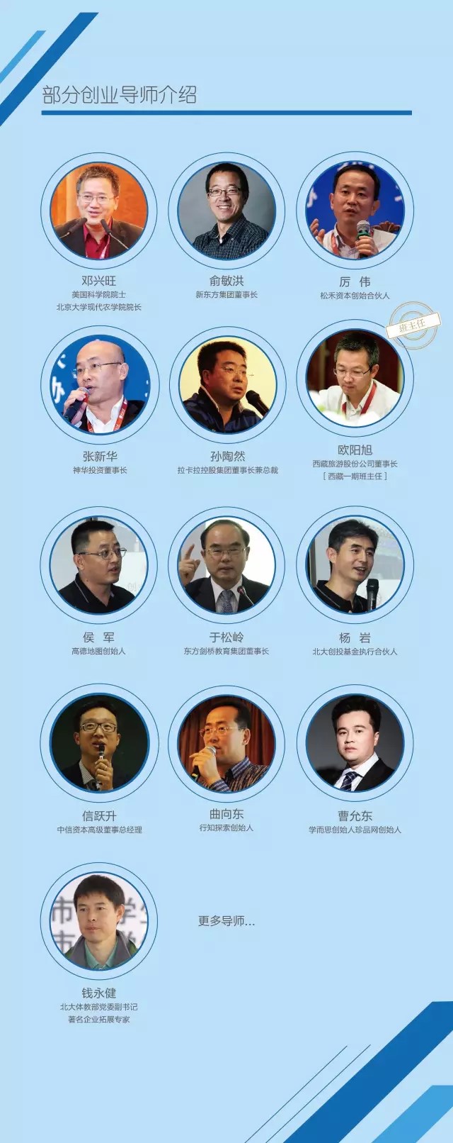 除此之外,这次的导师中,既包括拉卡拉创始人孙陶然、高德地图创始人侯军等成功创业家,曾和你一样,体会过创业的跌宕起伏;也包括王新超、王亚非、傅强等北大学者、行业专家,从理论与实战角度,给予你智慧的指引;更有松禾资本创始人厉伟、中信资本信跃升这样的创投教父、资本掌舵人,以投资的视角,帮你分析得失。